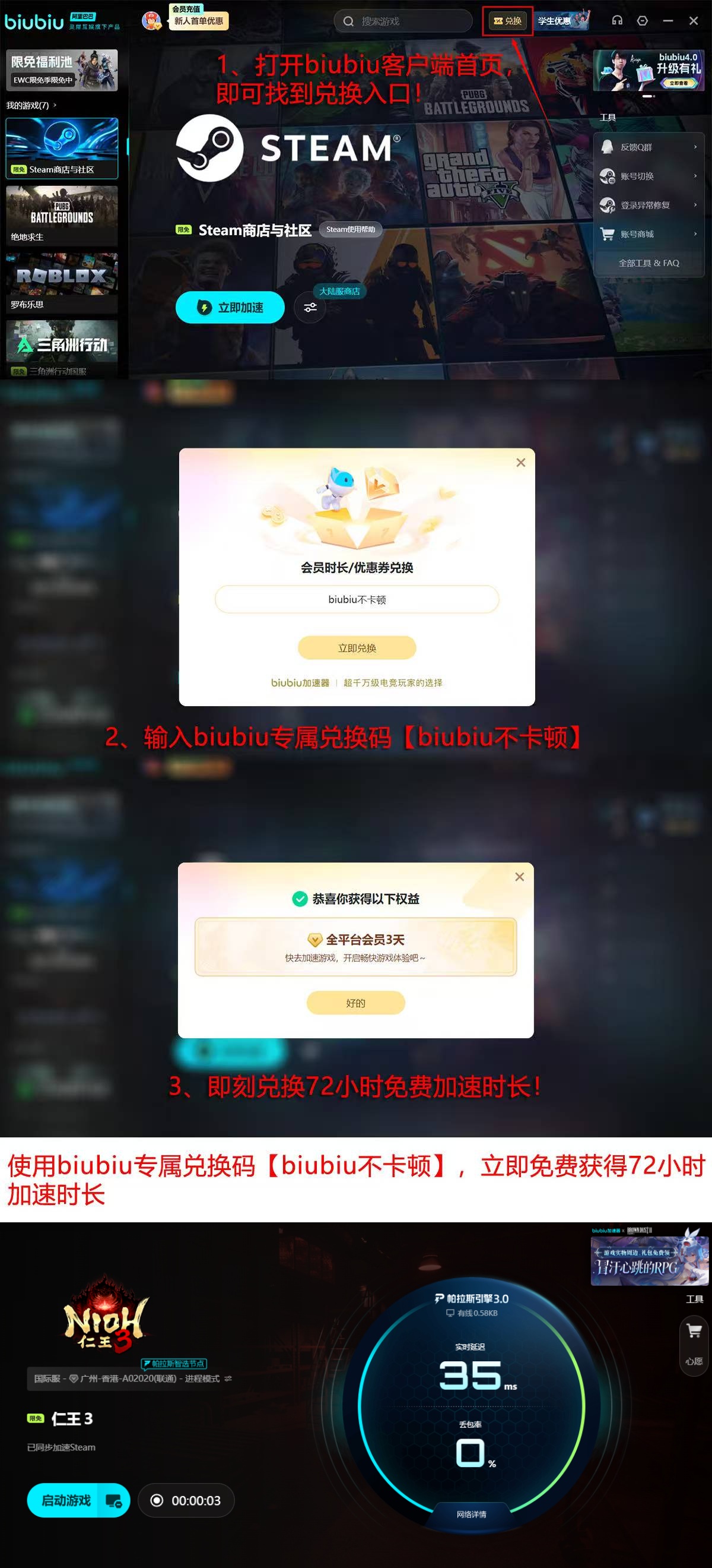 新用户注册后即可激活24小时全功能试用权限。所有平台用户输入通用激活码【biubiu不卡顿】,可额外获得72小时加速服务时长。首次注册用户累计享有96小时无限制加速体验,覆盖《仁王3》全部联机场景,包括稀人召唤、常世同行、远征任务及血刀修罗挑战等核心玩法,确保从入门到高难内容全程流畅运行。