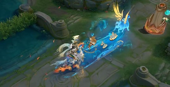 技能特效方面,关羽神骥镇沧海普攻横刀斩浪,被动静止时马儿环绕庙前,冲锋状态披风幻化成华美金色,马头燃起烈焰寓意鸿运当头。一技能策马劈开巨浪,二技能将惊涛卷入地面罗盘,大招召出马限五位同伴的神骥并驾齐驱。