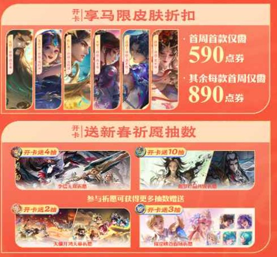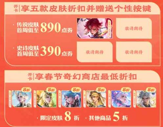 开卡后首款马年限定皮肤首周仅需590点券,其余每款首周890点券。花木兰情人节限定皮肤异界灵契首周1430点券,使用好运卡专属优惠券后仅需890点券。传说皮肤首周低至890点券,史诗皮肤首周低至390点券。