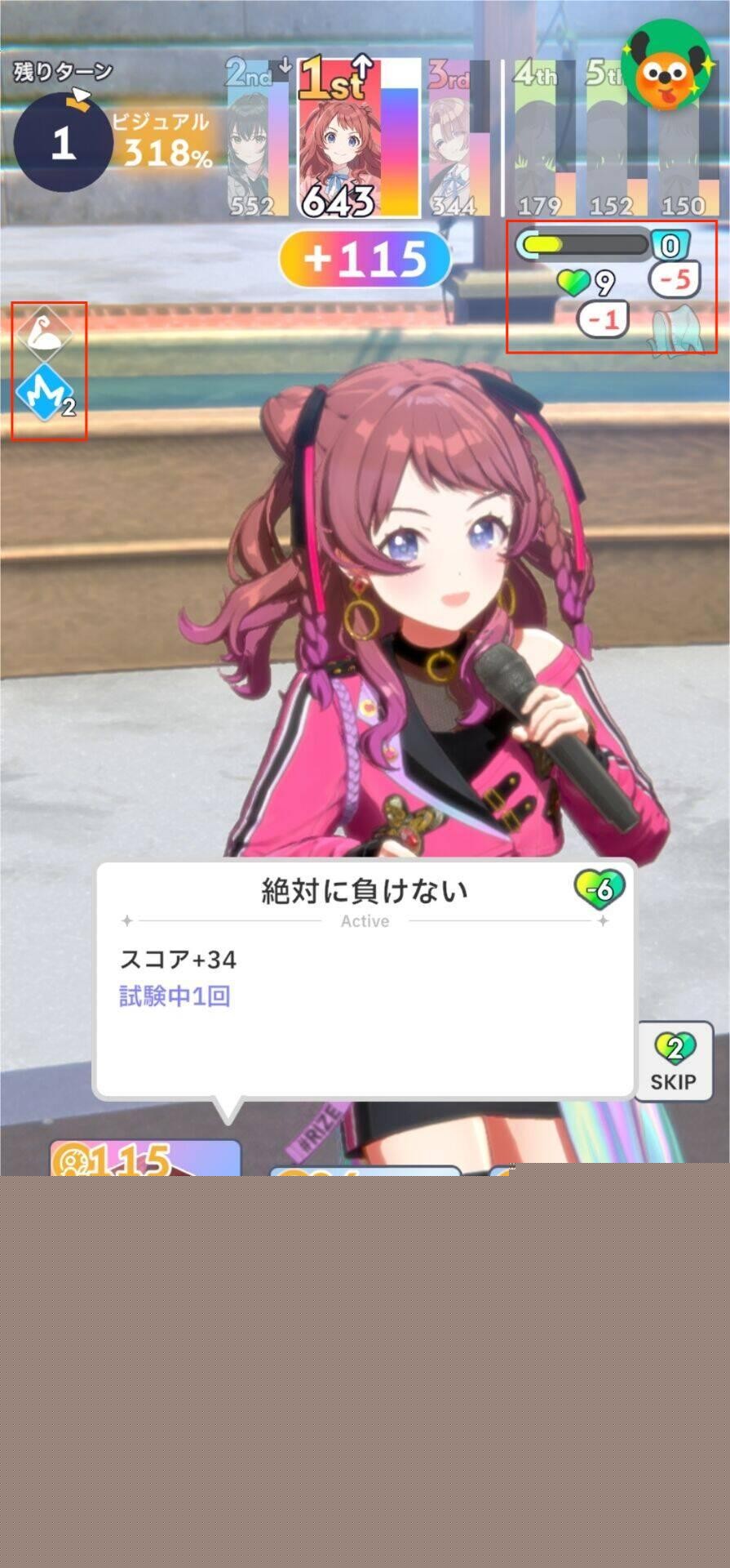 体力为0或者手牌极烂的情况可以选择右下方的skip空过这一回合,并且能帮助你手动恢复2点体力(这喘气有点亏本,感觉不如0费4元气。但人总是会折中的,如果10好调手上还有3张4费回心情的足取,并且左上方转盘是从没点过的属性,那偶尔喘口气也不是什么坏事(狗头))