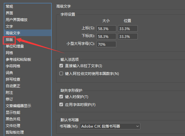 4、在打开的窗口界面中,点击左侧栏中的"排版"选项。