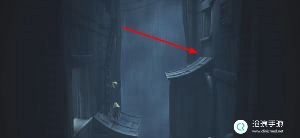 向右继续前进离开房间,在屋顶最右侧爬上木架。