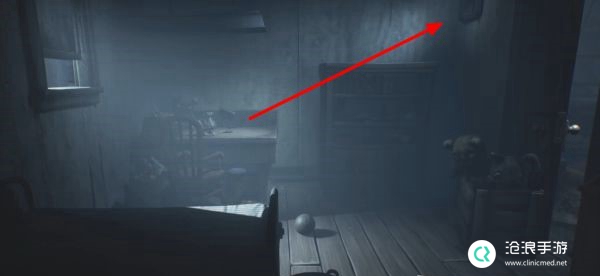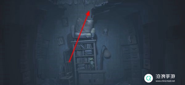 离开电视机后来到一个全新的房间中,通过书架爬到上方平台。