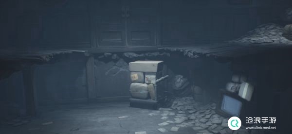 在下层房间中获得遥控器,是用遥控器打开电视后进入,可以直接到达上方的电视机处。
