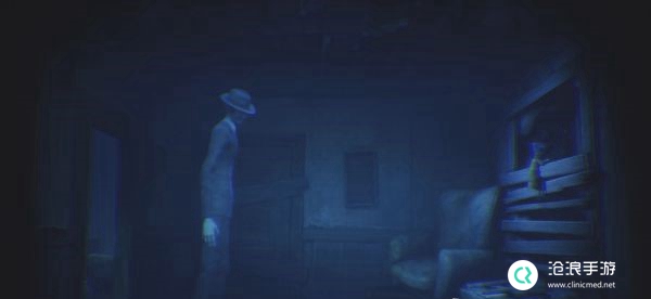 继续向前进入下一个房间后再次出现一台电视机,调整信号后进入电视机,这次进入电视后可以将走廊尽头的大门打开,发现在门后有一个身穿西装头带礼帽的瘦高男人坐在椅子上。