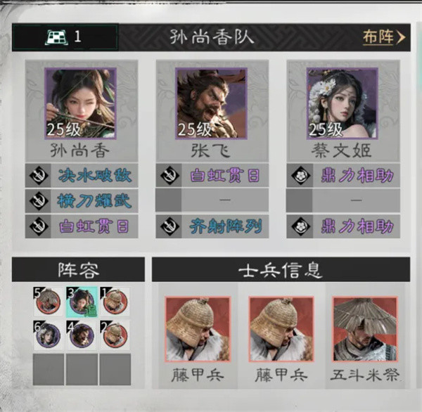 兵种站位:在蔡文姬的上方放置一个五斗米祭,在孙尚香和张飞的前方各放置一个藤甲兵。