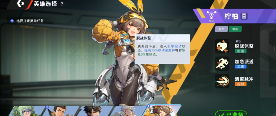 角色选择是跑刀成功的第一步。推荐首选英雄“柠柚”,其核心机制围绕机动性构建:被动技能可在脱离战斗后持续恢复生命值,彻底规避血包消耗;同时触发期间移速提升15%;主动技能提供超长持续时间的加速效果,显著增强突发状况下的生存能力与位移效率。