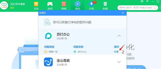 2、在软件管家界面上方,可以看到“净化”功能选项,点击它进入净化功能页面。