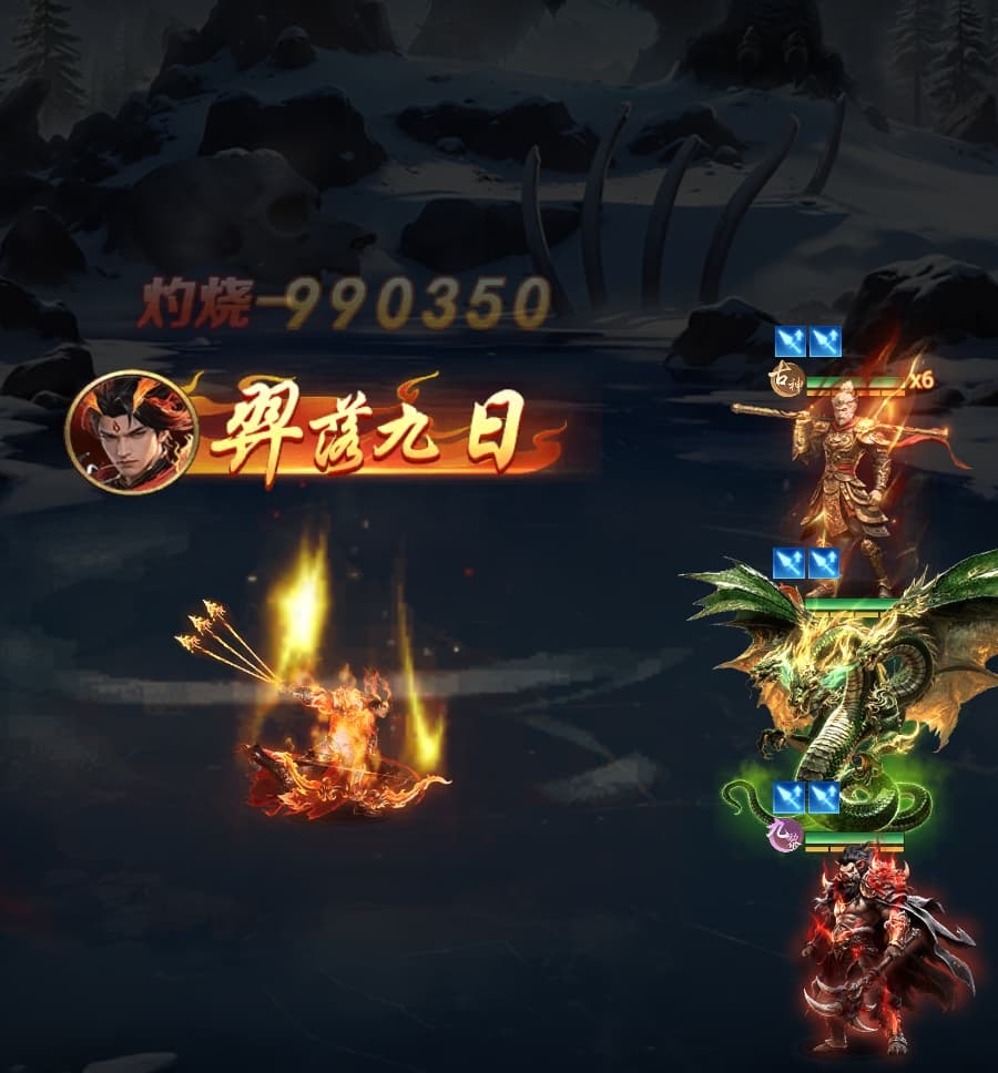 2.角色养成深度显著影响其实战上限。升至九星时,“羿落九日”将恒定获得20%额外伤害加成;突破至真仙1重后,技能对生命值高于30%的目标额外造成40%伤害,大幅提升对健康状态敌人的压制效率;抵达真仙3重时,机制进一步分化:自身生命高于50%时,怒气技伤害再提升45%;若生命低于50%,则怒气技可转化为治疗效果,按一定比例回复自身血量,兼顾输出与生存韧性。