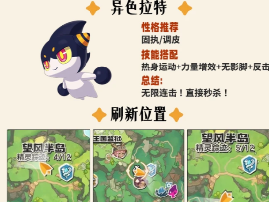 异色恶魔狼固定刷新于商店街西侧区域,与女洛克对话后即可激活其出现条件。推荐性格为固执或调皮,技能搭配暗突袭、力量增效与趁火打劫,形成高爆发物理连段,在副本清图与PVP对战中均表现稳定。另一高人气异色单位伊瑟拉特,具备无限连击特性,战斗节奏流畅、压制感强,刷新点位于望风半岛。性格同样优选固执或调皮,核心技能组合为热身运动、无影脚与反击拳,兼顾启动速度与持续输出能力。