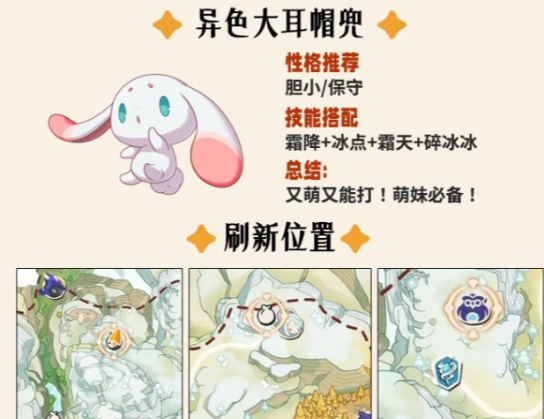 若倾向法系路线与高颜值设定,异色大耳帽兜值得重点关注。其刷新点分布在岚语峰顶部、雪山BOSS附近以及悬崖传送点三处。不同于前两者,该精灵适配胆小或保守性格,主打冰系法术输出。推荐技能组合为霜降、冰点、霜天与碎冰冰,兼具控场稳定性与群体伤害覆盖率,面对被冰系克制的目标时,往往能实现快速压制乃至秒杀。
