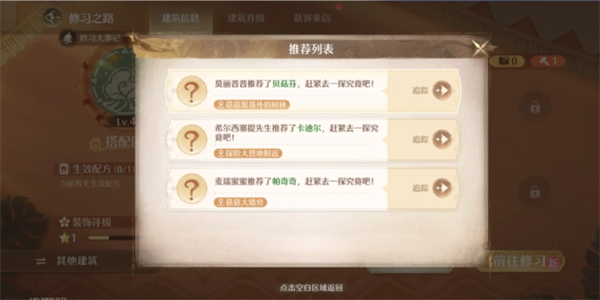 2、接下来会收到一个NPC的美鸭梨消息,回复后去蜗牛城搭配协会接一串任务按指引走即可建好修行之路,注意继续和那俩菇对话做任务,依次解锁经营和学习功能