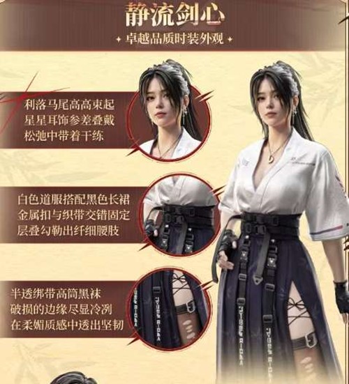 女款:利落高束马尾配参差星星耳饰,白色道服搭配黑色长裙,金属扣与织带交错勾勒纤细腰肢,半透明绑带高筒黑袜透出坚韧光感。