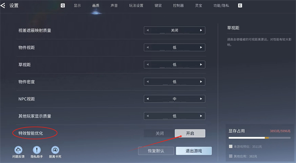 3、特效优化打开,其他都是最低