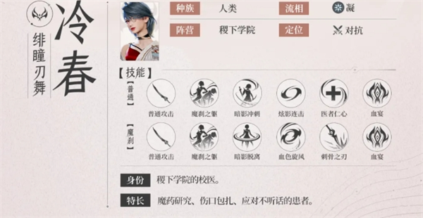 冷春是王者荣耀世界首发原创英雄,定位对抗位,能够在医者与魔刹两种形态自由切换,集自奶、烧血爆发、位移、续航于一体,单刷、开荒、高难本都很强。以下是对英雄冷春技能的介绍。