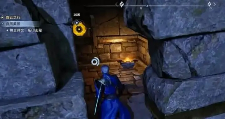 2、石碑碎片一共要收集三块,分散在附近几个地方。第一块在左侧建筑侧面的洞穴里,洞口有个标靶,打破标靶门就开了,进去拿就行。第二块在前方铁栅栏里面,这里要动点脑子,把蓝色石头牵引过去压住压力板,栅栏门才会打开。第三块最简单,直接在最上方的平台上,走上去拾取就好。三块碎片都拿到之后,回去把碎片安装拼接到石碑上,完成拓印,等NPC过来看完,再对话一次。