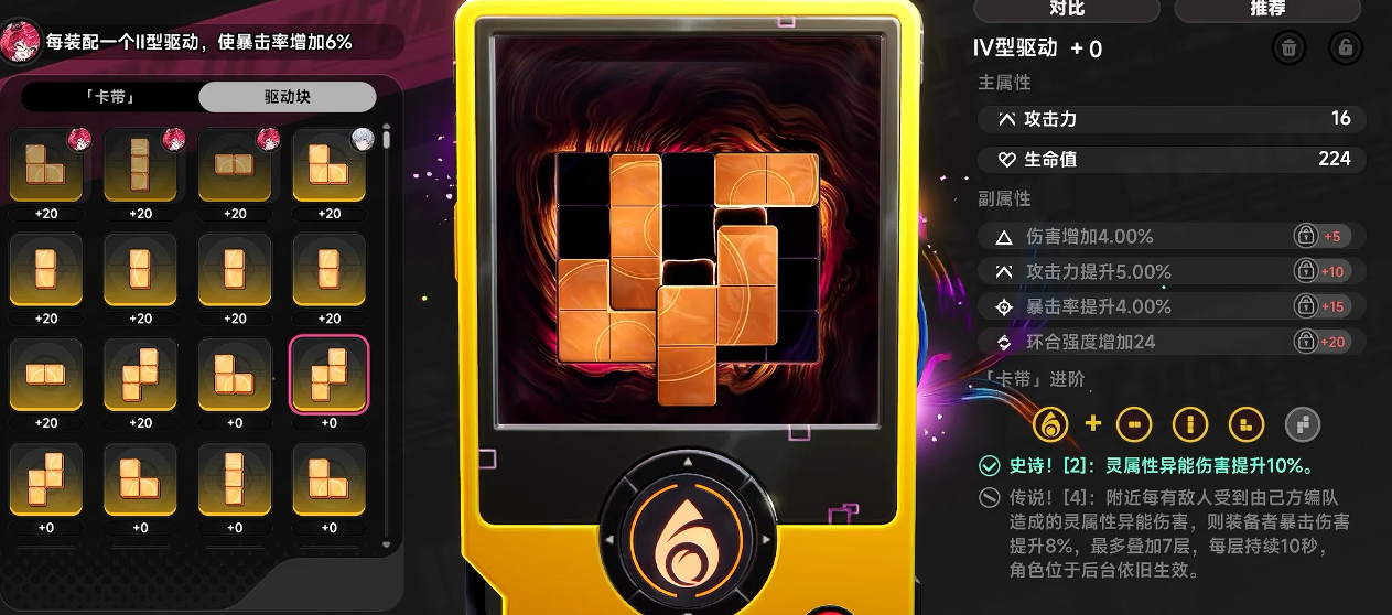 在词条装配环节,需选取两个匹配的弧盘组成套装,激活专属套装效果。成功激活后,界面中对应词条区域将呈现蓝色高亮标识。随后聚焦主词条筛选——确保其属性与角色核心需求严格一致(例如主C角色优先锁定“暴击伤害+”主词条),副词条则随主词条绑定自动适配,大幅降低试错成本。最后装配对应能量块,方可完整触发整套弧盘协同增益。