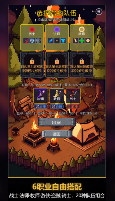 游戏采用竖屏黑暗幻想风格,开局即进入沉浸式叙事场景。玩家需从六大基础职业中任选三位组建初始小队,职业间存在20种合法组合路径。每位角色不仅拥有差异化主动技能与专属被动效果,还具备可成长的词缀体系——精英敌人会携带不同属性前缀,直接影响伤害类型与结算逻辑。随着层数推进,玩家可通过技能树系统持续强化角色核心能力,形成个性化成长曲线。