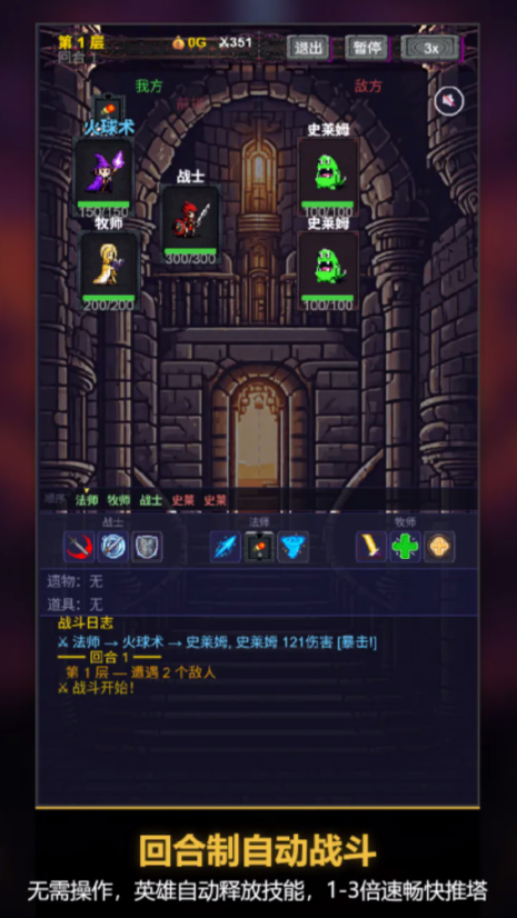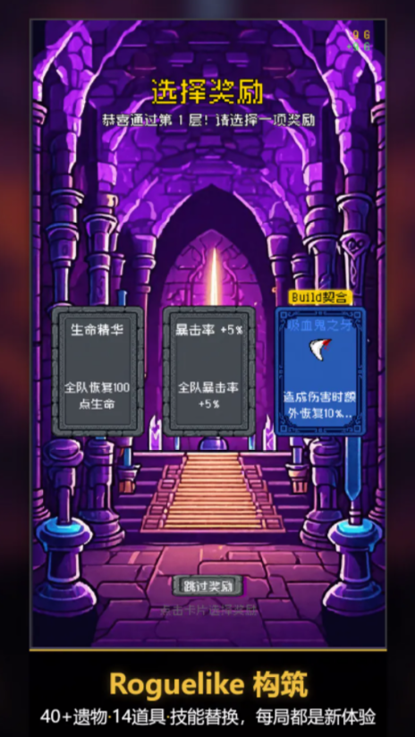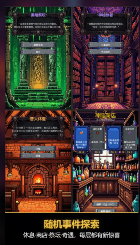战斗全程为自动释放模式,玩家专注策略决策:包括职业搭配、遗物取舍、事件应对及路线规划。全盘设计遵循轻操作、重思考原则,单局时长稳定控制在8至10分钟区间,适配通勤、午休等典型碎片化使用场景。游戏中内置十余种功能型道具,其触发逻辑与生效条件均随局内变量实时变化,进一步强化Roguelike不可预测性。