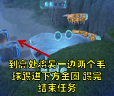 9、到高处将另一边两个毛球踢进下方金圈,踢完结束任务