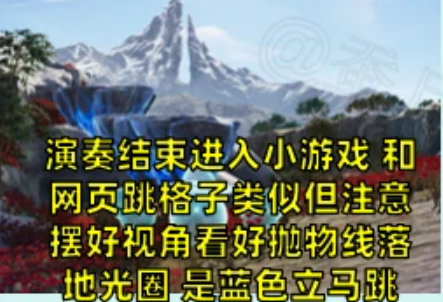4、演奏结束进入小游戏,摆好视角看好抛物线落地光圈,是蓝色就跳