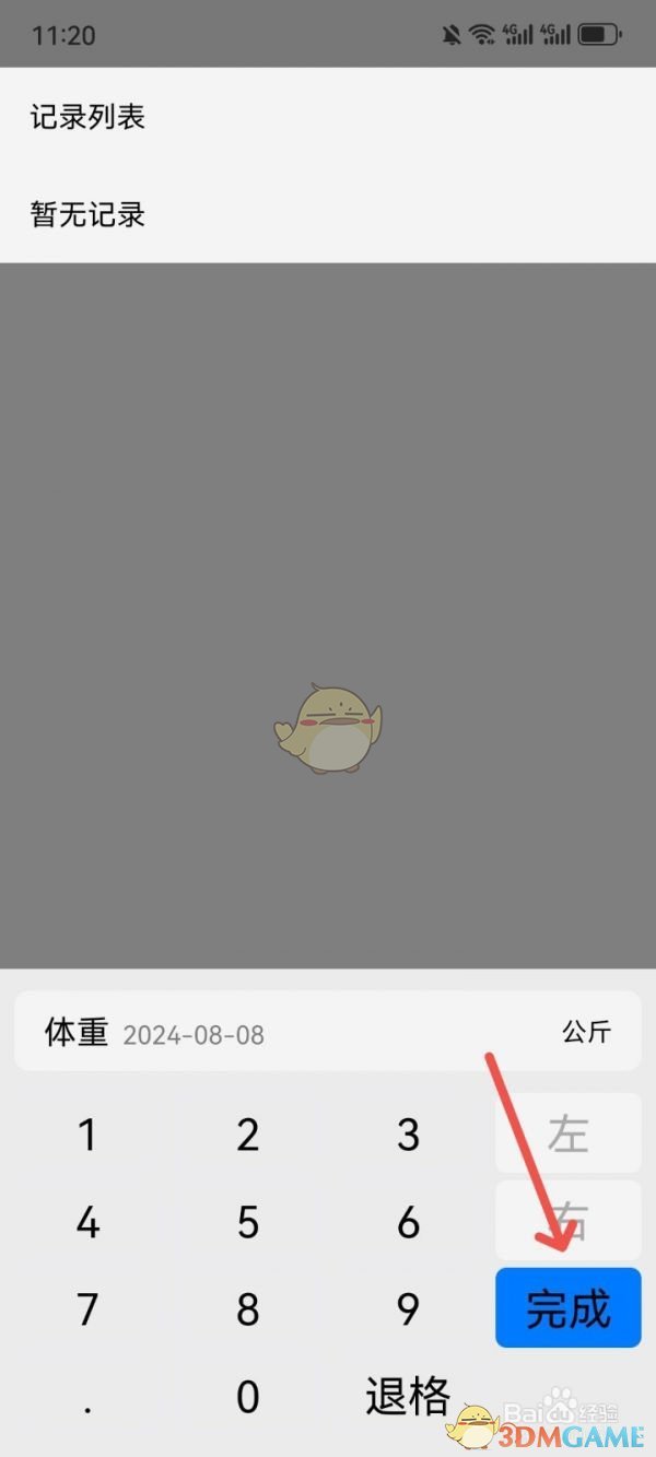 3、进入体重数据记录页面,输入体重数据,点击完成按钮即可