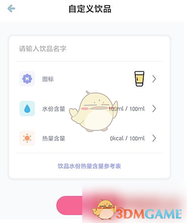 4、输入饮料的名字,设置图标、水分含量、热量含量等,最后点击完成即可。