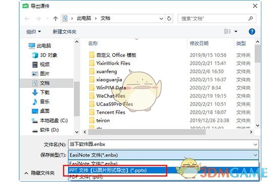 3、弹出导出课件的界面,选择你想要保存的路径后,在下方的保存类型中选择“PPT文件”,它就可以帮助我们将课件转化为PPT,不过课件内容将会以图片的形式进行导出,用户在确认课件已经制作完成的情况下,就可以生成PPT啦!如下图所示:
