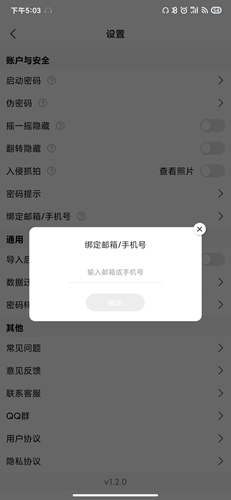 第一步:启动暗盒APP后,点击界面右上角的设置图标进入功能菜单。在设置页面中向下滑动,找到账号安全选项中的"绑定手机号/邮箱"功能入口。