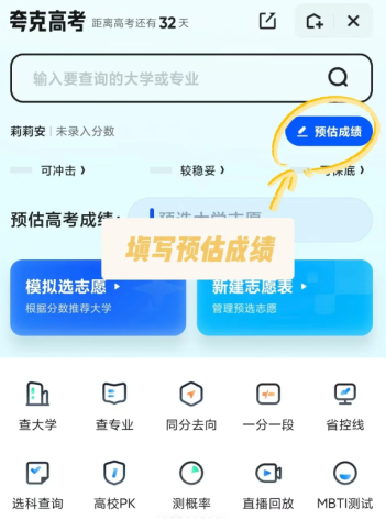 2.填写所在高考地区和预估考试成绩,系统将基于此数据提供推荐;