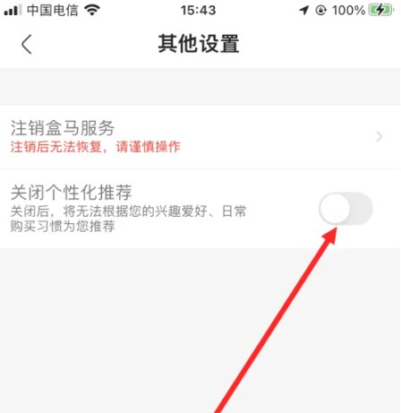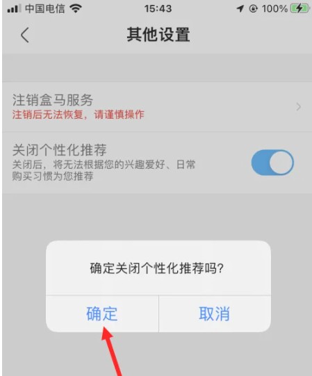 首先在手机上打开并登录盒马鲜生,并在首页面点击【我的】,进入个人页面后,点击【齿轮】,这样会进入【设置】的页面,在该页面里点击【其他设置】,再点击【关闭个性化推荐】后面的按钮,最后,点击【确定】即可。