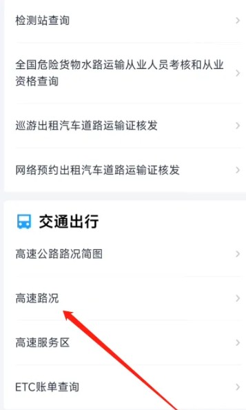 在交通运输服务页面中,定位【高速路况查询】功能按钮。点击后将跳转至实时路况展示界面,系统会以地图结合文字的形式呈现当前各条高速公路的通行状况、施工路段及突发事件等信息。