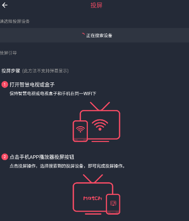 登录账号后选择需要投屏的影视内容,在播放界面点击右上角投屏图标即可触发设备搜索。