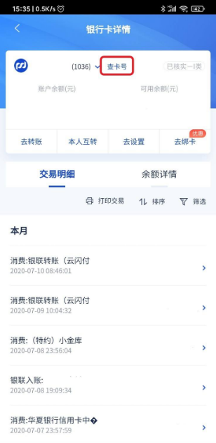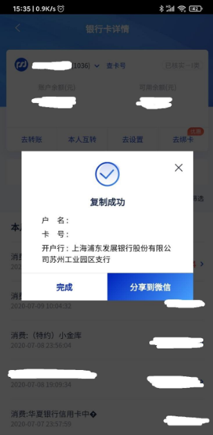 跳转到“银彳卡详情”界面,点击“查卡号”字眼。可以看到该借记卡的开户行为“苏州工业园区支行”。