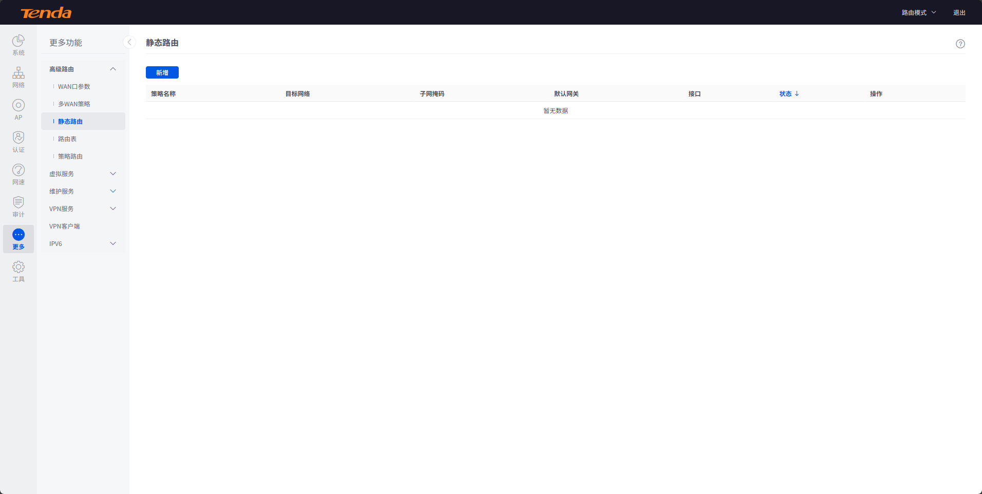 腾达G300-F如何设置静态路由,登录管理界面,连接路由器LAN口通过192.168.0.252登录路由器管理界面,点击“更多”-“高级路由”-“静态路由”,点击“新增”填写静态路由。