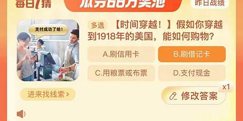 以上就是淘宝大赢家假如你穿越到1918年的美国能如何购物答案了,关于此次问题,大家在选择答案时,就选择B和D这两个选项就可以了,这两个选项就是本次的答案了,大家就可以根据这两个答案去回答了,也就可以正确答对本次的问题了。
