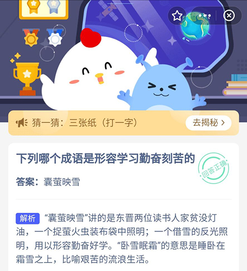 生活中有许多成语都是形容学习勤奋刻苦的,在今天的支付宝蚂蚁庄园小鸡答题中,关于囊萤映雪,卧雪眠霜这两个成语,究竟哪一个是形容学习刻苦的呢?想知道答案的小伙伴赶紧来一起看看吧。