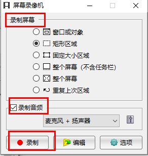 2、在“屏幕录像机”界面,根据需求设置好录制屏幕大小和音频,然后点击“录制”。