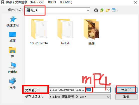 6、接着跳转到保存界面,将其保存到视频,如果文件名后缀不是“mp4”,将其改成“mp4”,如下图,然后点击“保存”即可。