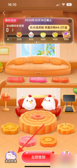打开支付宝蚂蚁庄园的家庭页面,点击“家庭管理”。