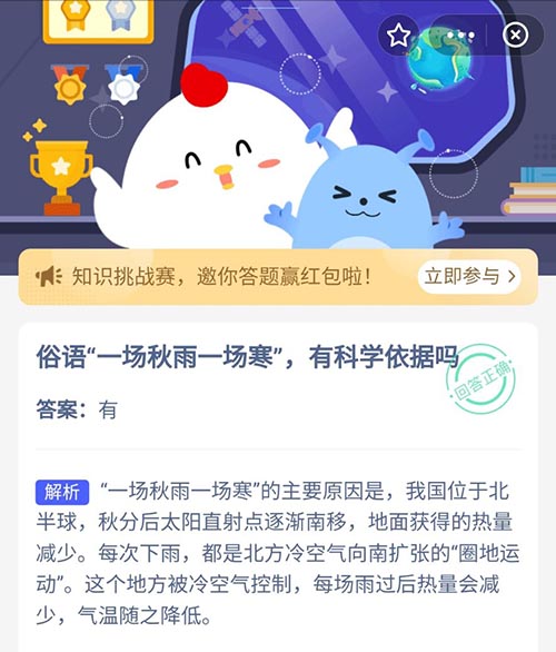 以上就是关于俗语一场秋雨一场寒,有科学依据吗?这个问题的正确答案,得到正确答案的小伙伴们,赶紧去领取属于自己的小鸡饲料吧,明天也会持续为你更新的哦。
