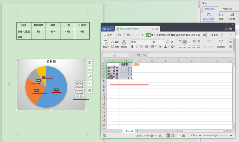 在图表类型中选择“饼图”,会弹出一个示例饼图以及一个“数据表”窗口。此时,“数据表”中的数据就是饼图的数据源。