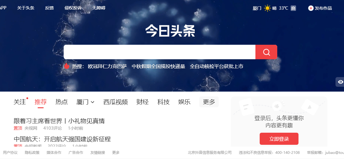 今日头条官网首页登录和网页版官方入口链接为用户搭建了一个与精彩世界相连的桥梁。在官网首页,你可以轻松开启你的信息探索之旅,发现各类新鲜事。登录账号后,你能享受专属的个性化服务,让每一次浏览都充满乐趣。而网页版则进一步拓展了你的阅读和观看空间,让你能更尽情地汲取知识、感受精彩。