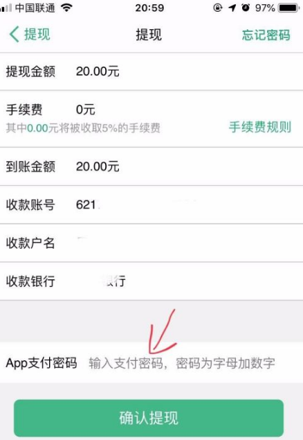 点击下一步后可以看到这样的页面,核对下信息,无误后点击箭头所指的支付密码,输入密码,再点击确认提现