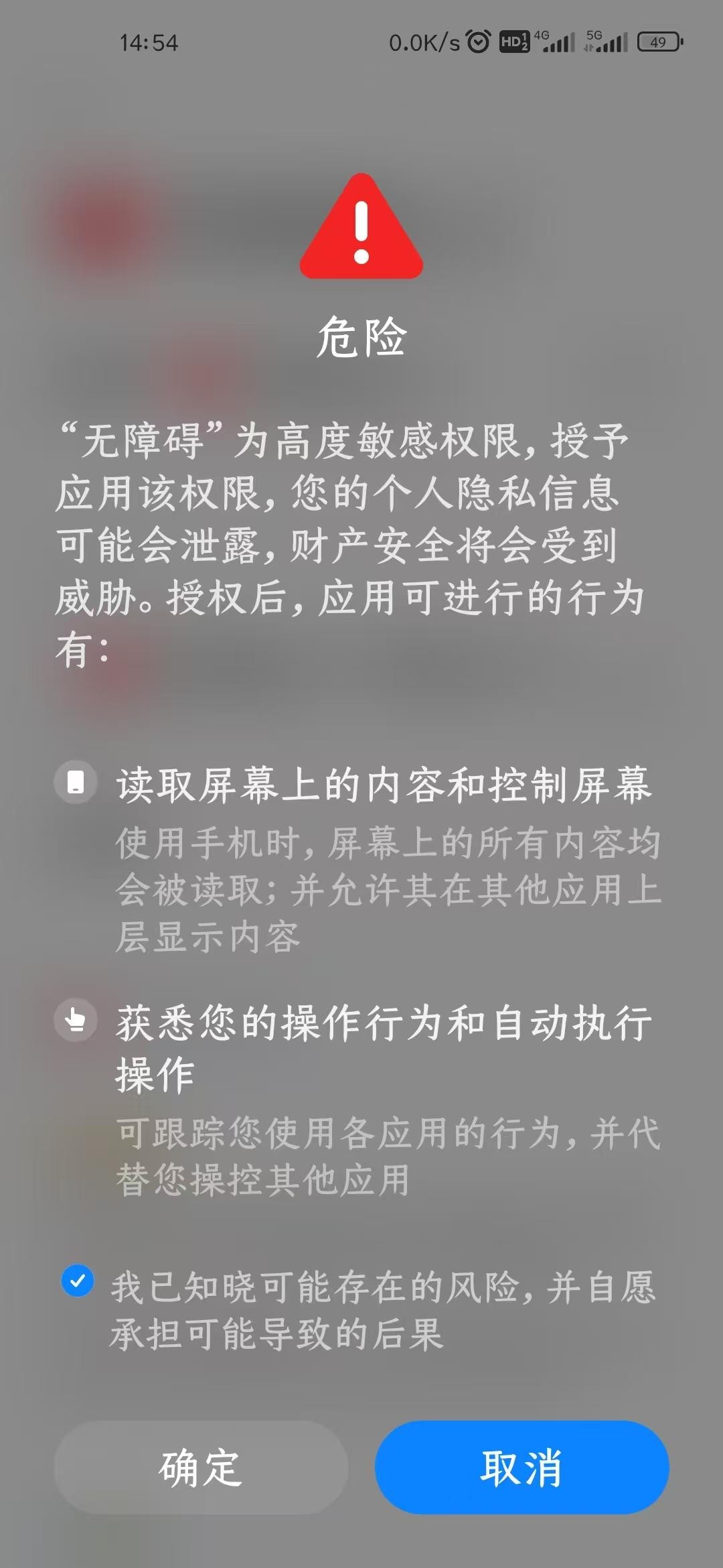 系统会弹出安全提示,确认后勾选知情选项: