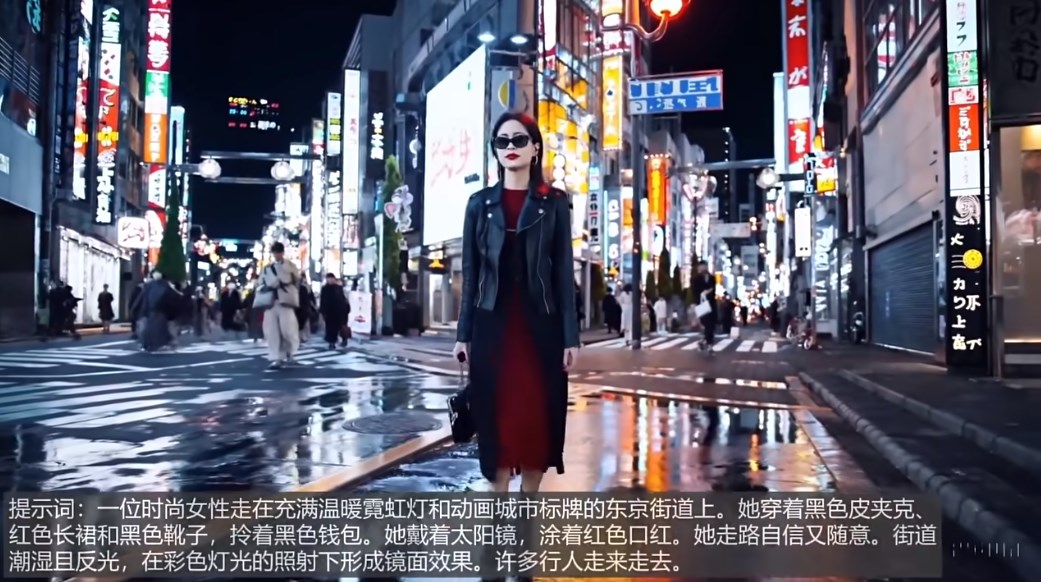 描述文本:一位时尚女性走在充满温暖霓虹灯和动画城市标牌的东京街道上。她穿着黑色皮夹克、红色长裙和黑色靴子,拎着黑色包包。她戴着太阳镜,涂着红色口红。她走路自信又随意。街道潮湿且反光,在彩色灯光的照射下形成镜面效果。许多行人走来走去。