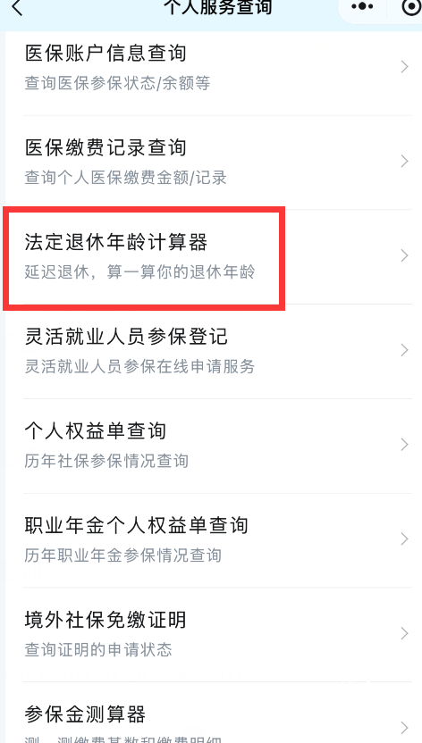 6、返回回到个人服务查询界面,点击下方的法定退休年龄计算器