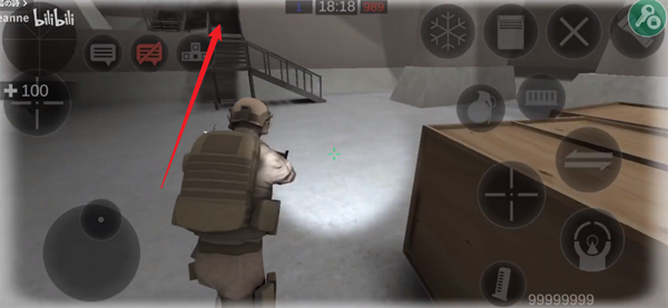 3、向后转并拖动左下角轮盘前进,就能够卡上楼梯。