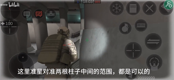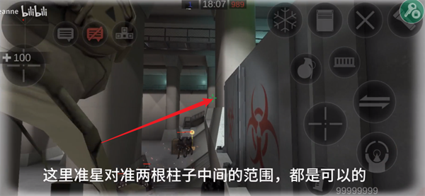 5、上楼梯之后将自己的准心对准两根柱子中间的范围。