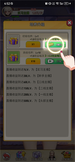 8、消耗金钱能够提升直播的收益,同时高级培养也同样需要看广告来进行获取。
